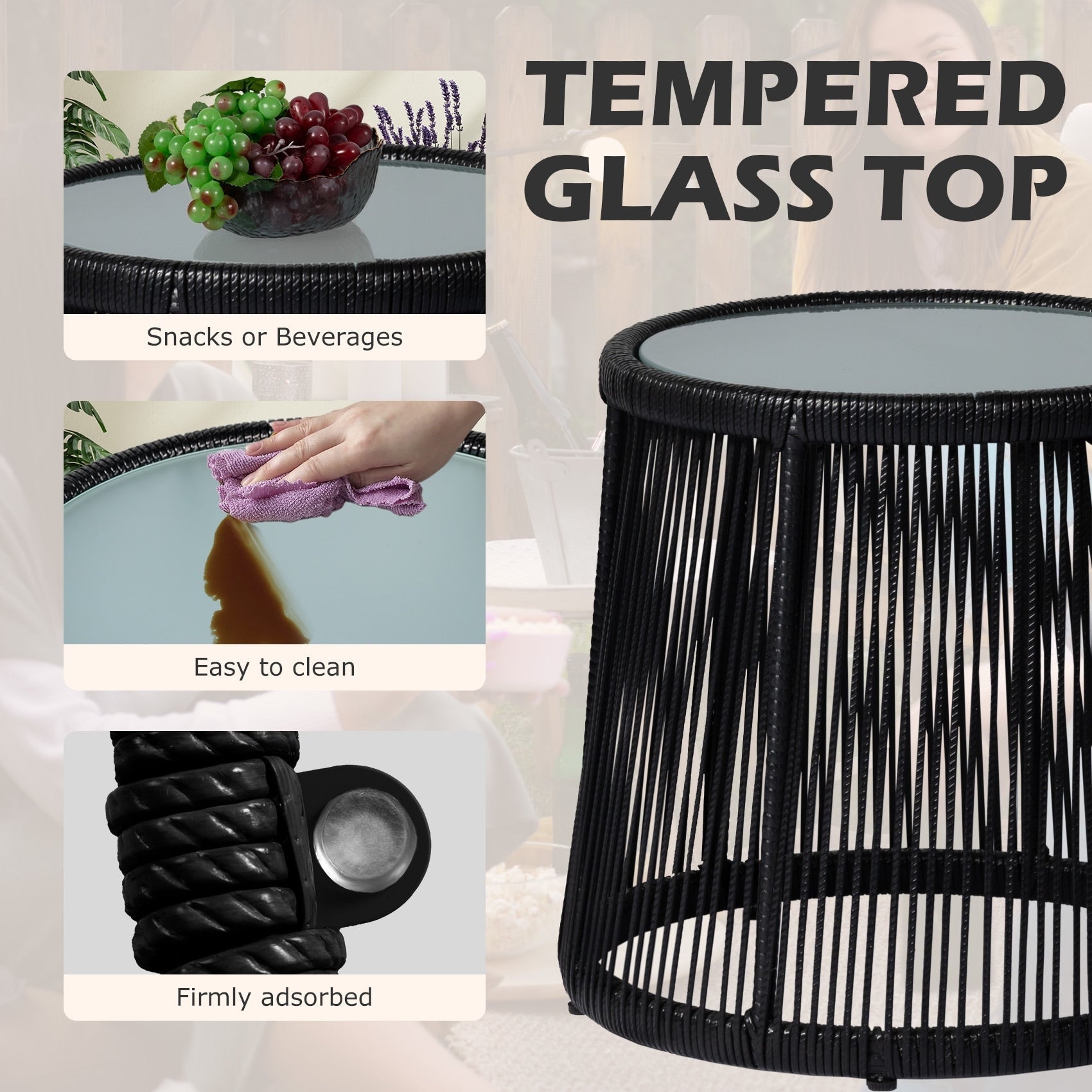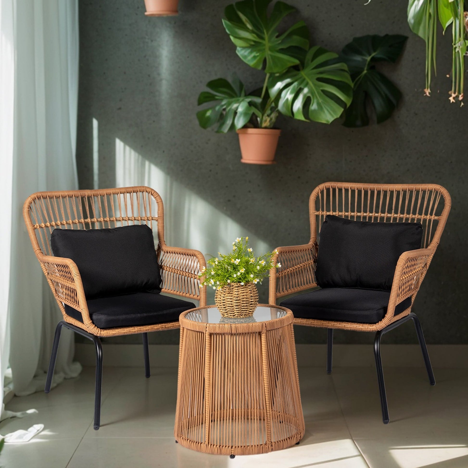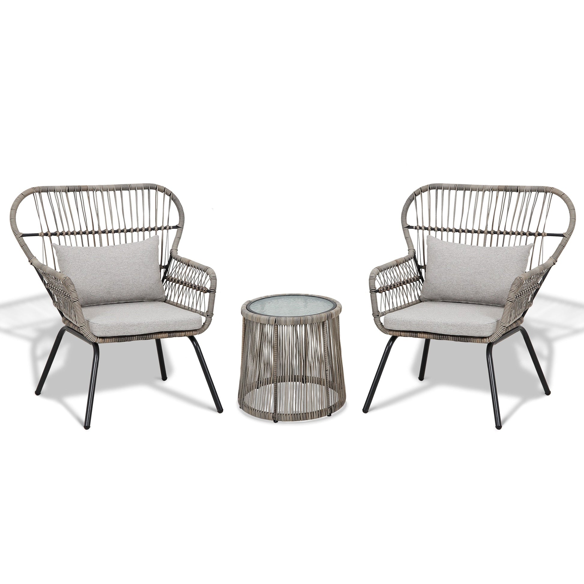 - The outdoor bistro set comes with 2 chairs and 1 tempered glass coffee table, fashion and elegant, good addition to your patio and provides you hours of cozy time.