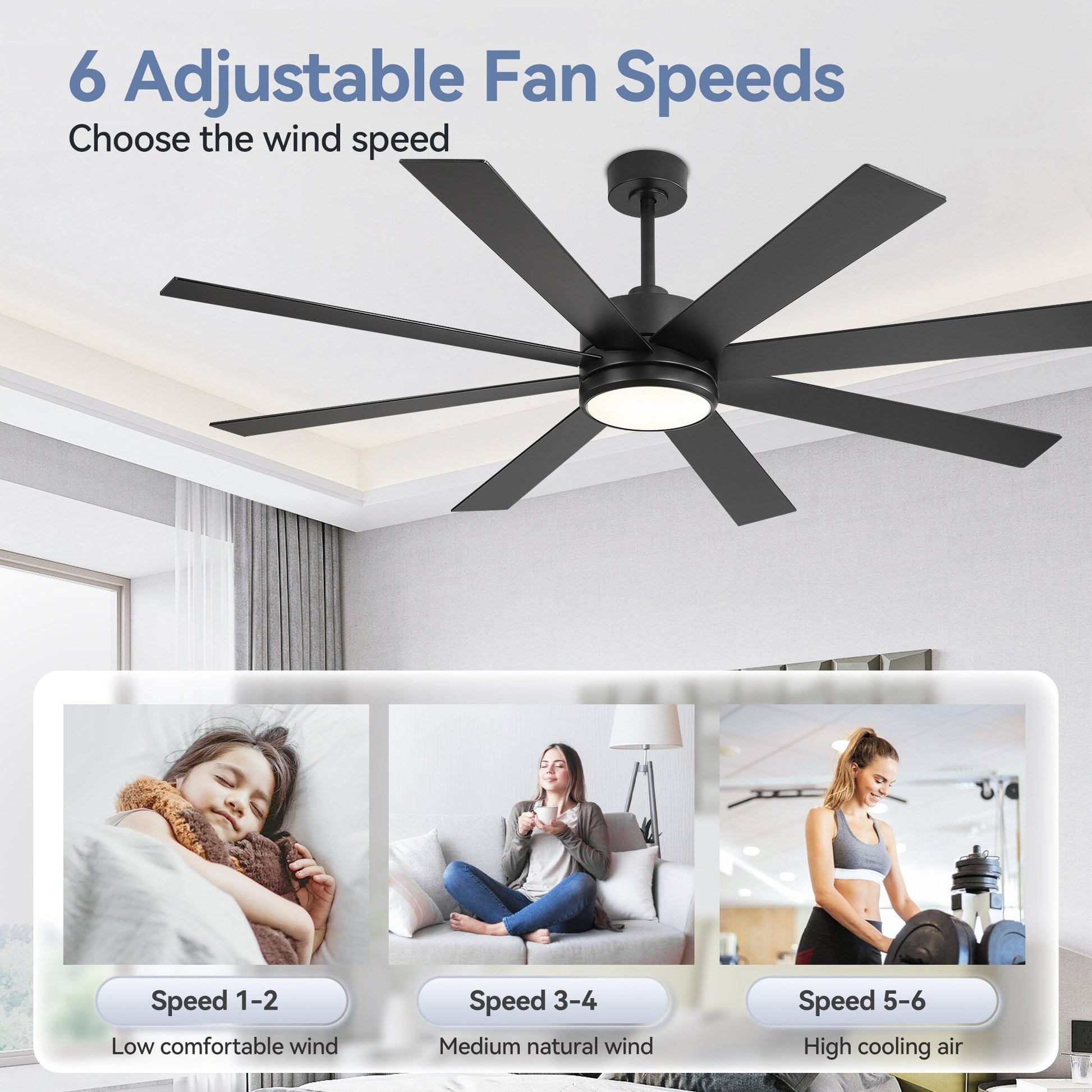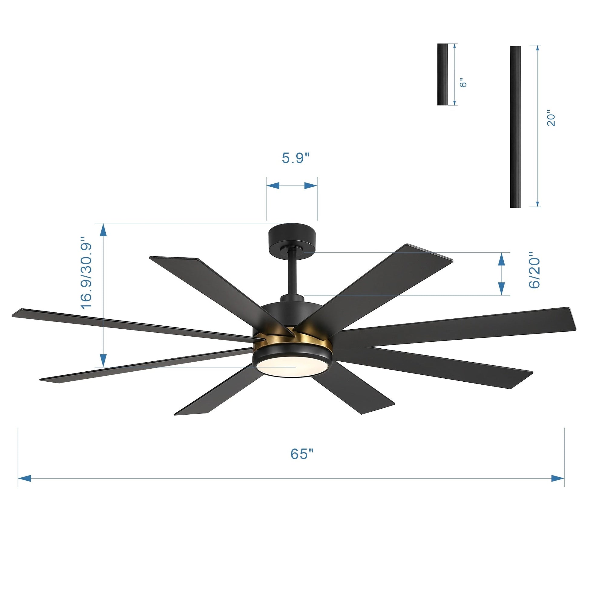 Ventilateur de plafond LED noir à 8 pales de 65 pouces avec éclairage et télécommande