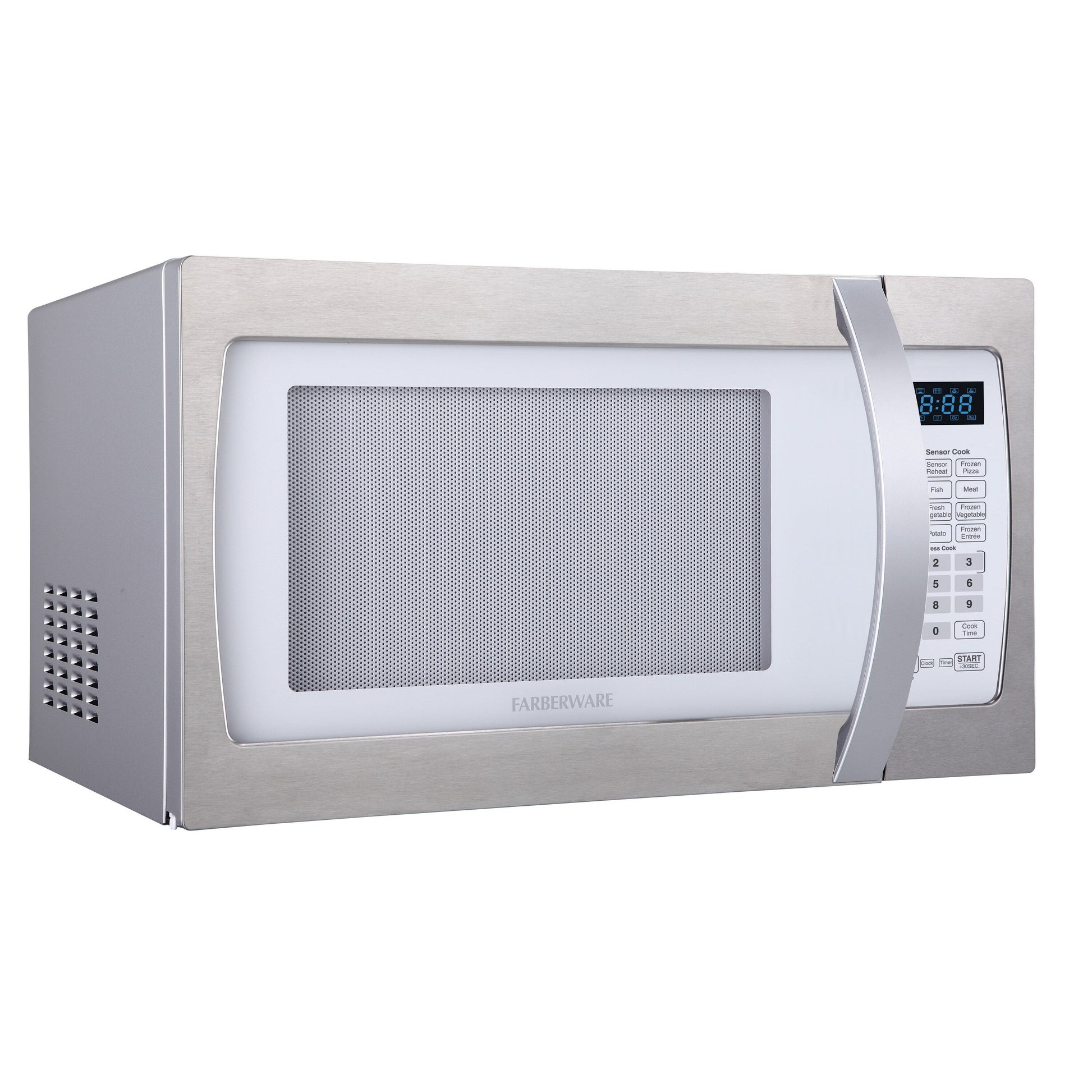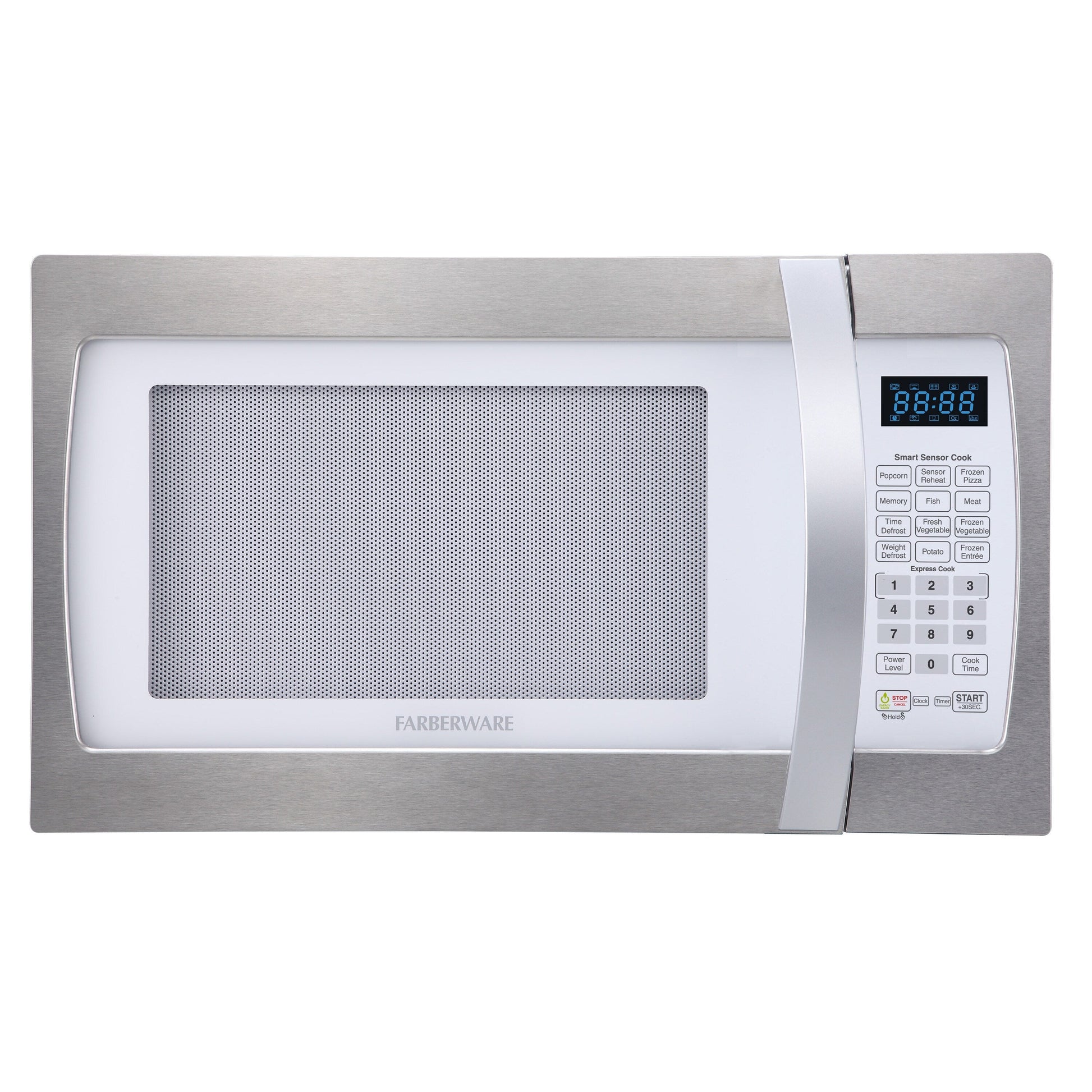 Four à micro-ondes Farberware Professional de 1,3 pi³ et 1 100 W avec cuisson par capteur intelligent, blanc et platine