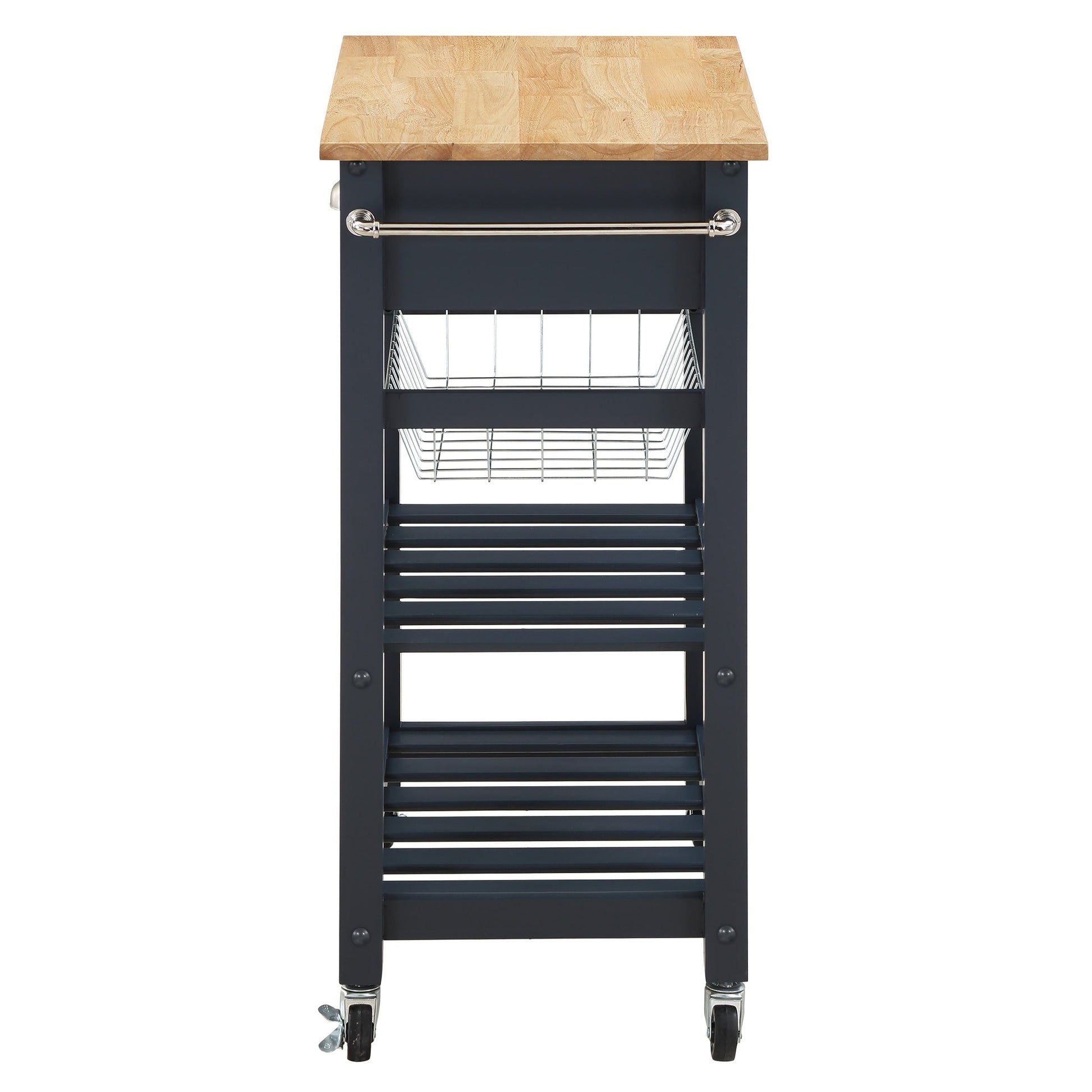 Solution idéale pour les maisons et les appartements compacts, notre desserte de cuisine avec plateau en bois allie esthétique et fonctionnalité. Son design multifonctionnel la rend idéale pour la préparation, le service et le rangement des aliments. Sublime sous tous les angles, elle présente une finition en bois massif peint contrastant avec les lignes épurées d'un plan de travail en bois robuste. Un tiroir supérieur accueillera tous vos ustensiles de cuisine, tandis que le charmant panier coulissant accueillera vos produits frais ou votre linge de cuisine. Deux étagères ouvertes à lattes sont idéales pour ranger et exposer vos grandes casseroles. Son porte-serviettes pratique, sa quincaillerie robuste et ses roulettes verrouillables lui confèrent un attrait durable. Indispensable dans toute maison, cette charmante desserte de cuisine deviendra assurément votre nouvel espace de prédilection pour cuisiner et ranger le désordre sur le plan de travail.
