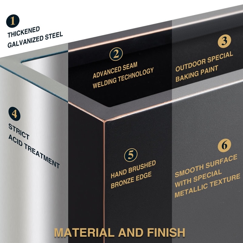 Qu'elle soit installée dans votre chambre, sur votre terrasse ou sur le mur d'entrée terne de votre maison, cette jardinière d'intérieur/extérieur de la série métallique, alliant design, durabilité et praticité, présente un design moderne et discret, idéal pour sublimer votre décoration extérieure ou vos espaces résidentiels et commerciaux. Fabriquée en acier galvanisé épais thermolaqué, entièrement soudée, avec une finition de qualité meuble, elle offre flexibilité et résistance aux chocs, aux fissures et aux rayures. De plus, elle est équipée d'un trou de drainage (en option) pour évacuer facilement l'eau excédentaire.
