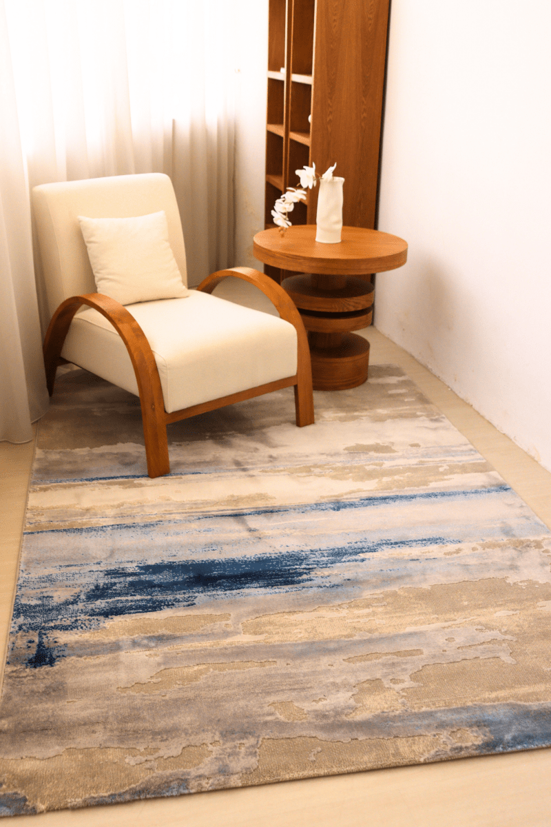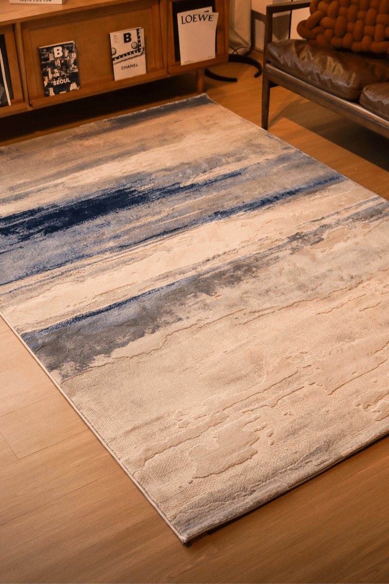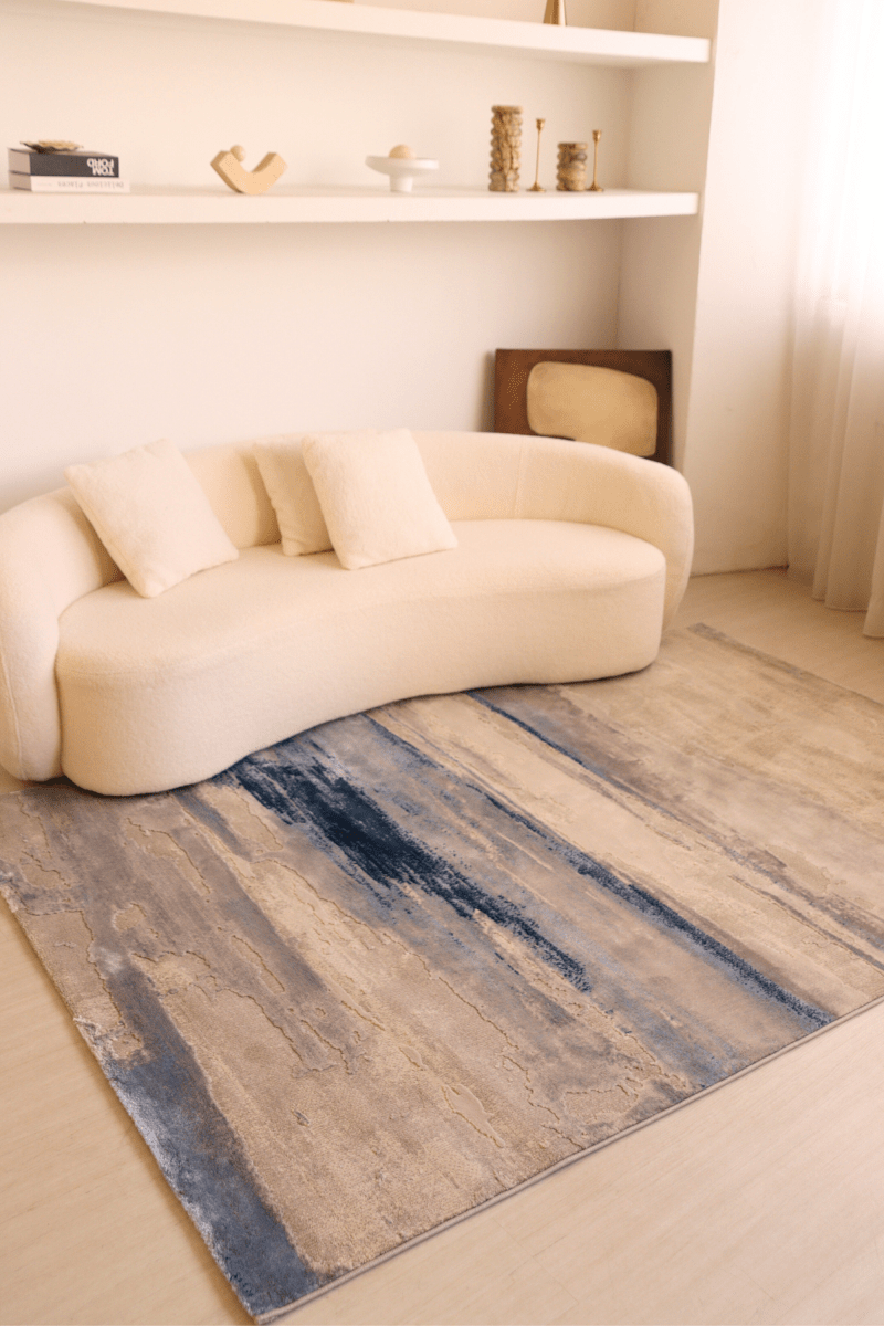 Ce tapis luxueux associe des tons beige sable à un bleu marine profond et un gris doux, évoquant un paysage marin serein. Son motif texturé et superposé ajoute profondeur et sophistication, créant un point de mire saisissant dans n'importe quelle pièce. Idéal pour les intérieurs raffinés, ce tapis apporte une touche d'élégance naturelle et de sérénité aux espaces haut de gamme.