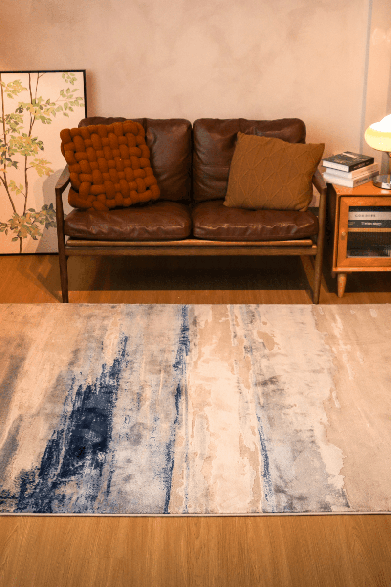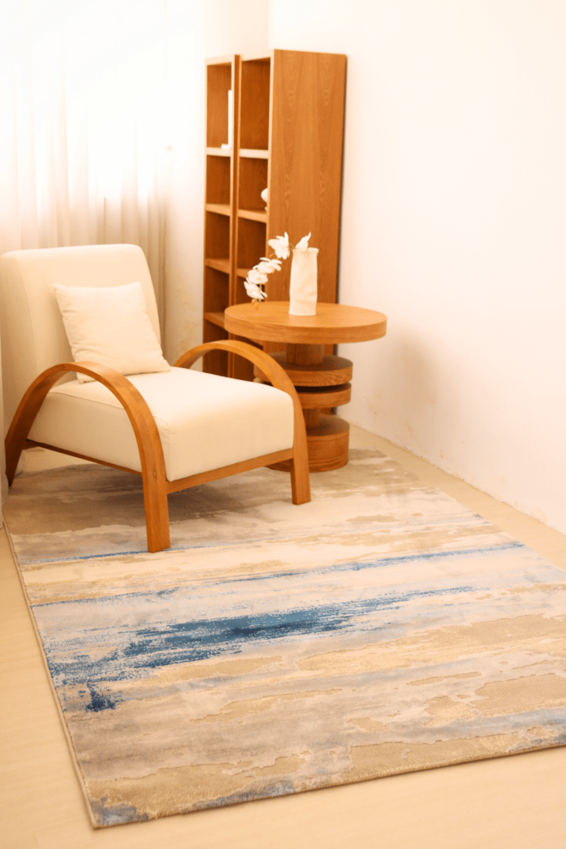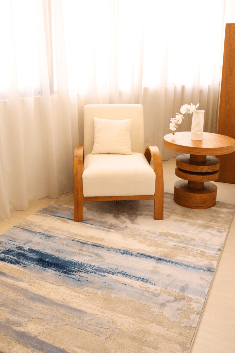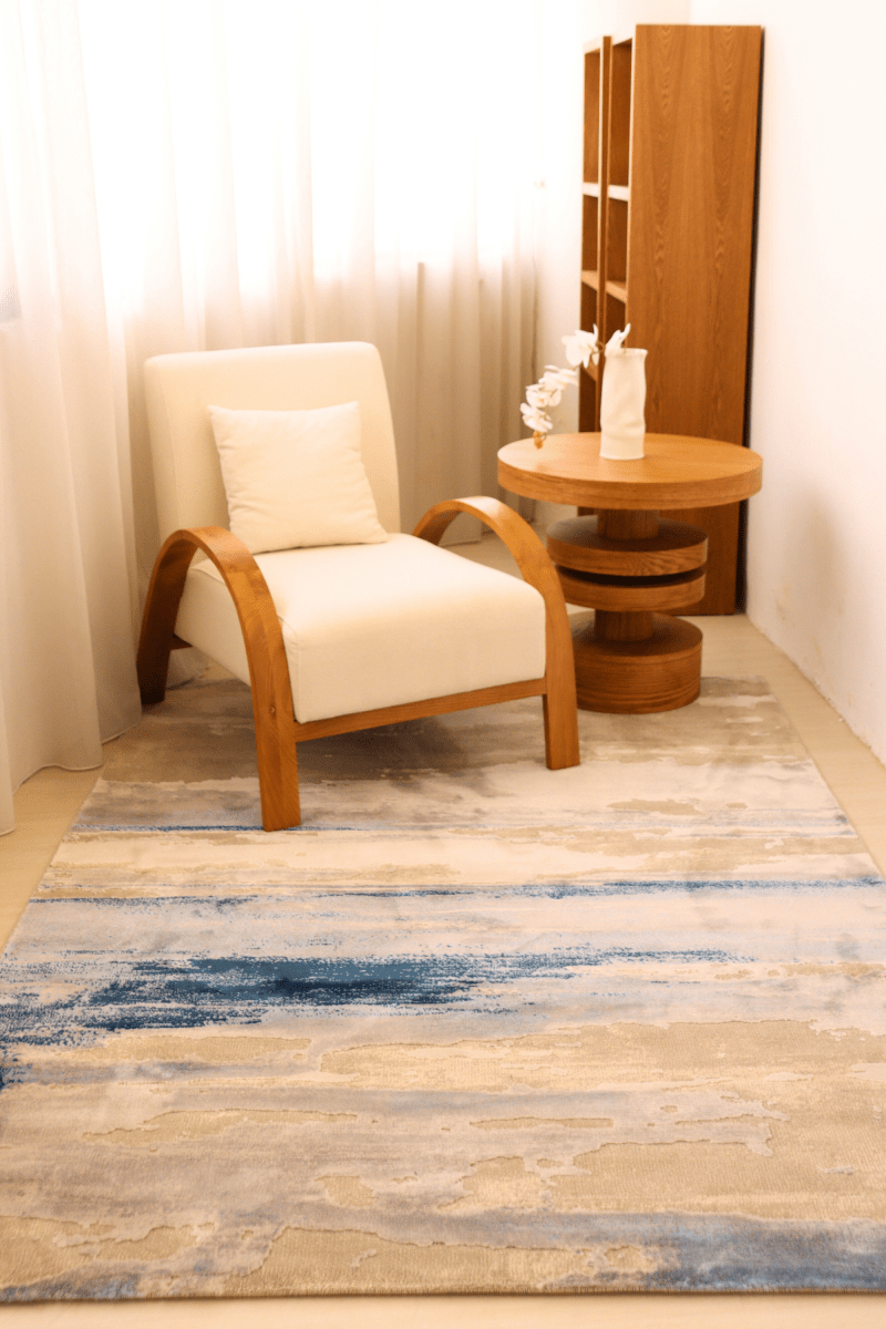 Ce tapis luxueux associe des tons beige sable à un bleu marine profond et un gris doux, évoquant un paysage marin serein. Son motif texturé et superposé ajoute profondeur et sophistication, créant un point de mire saisissant dans n'importe quelle pièce. Idéal pour les intérieurs raffinés, ce tapis apporte une touche d'élégance naturelle et de sérénité aux espaces haut de gamme.