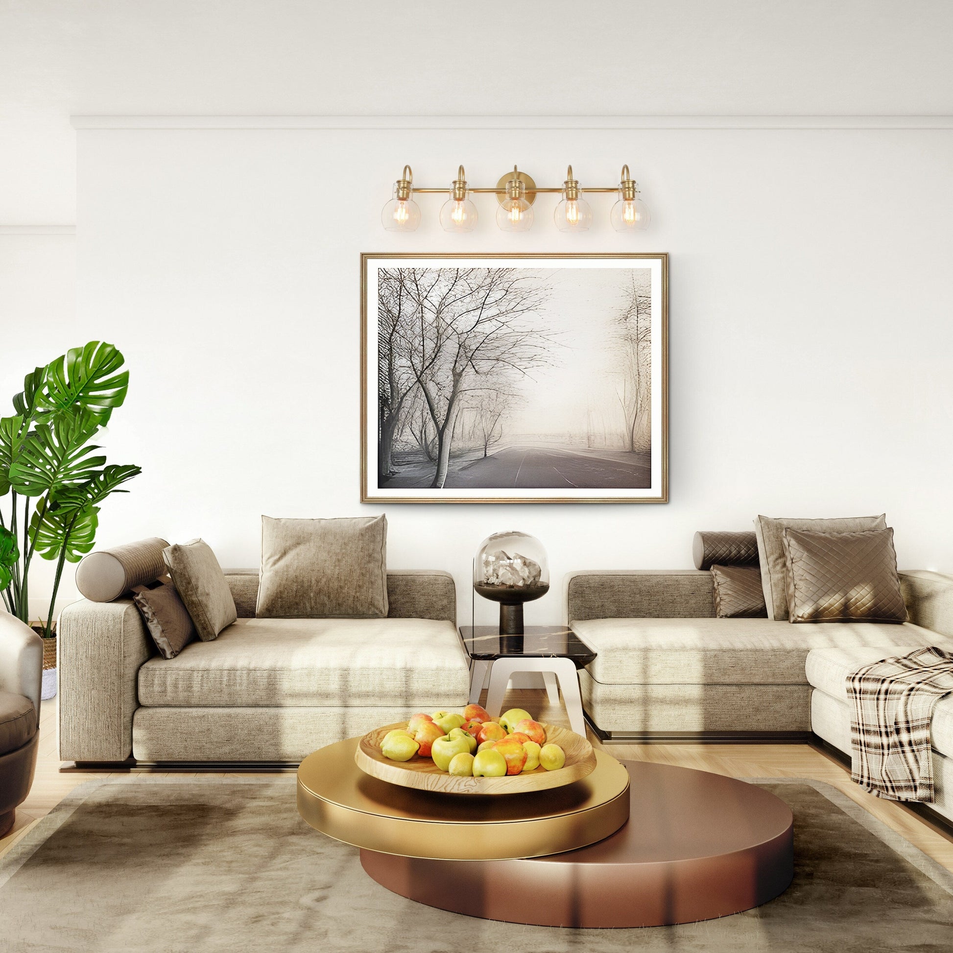 Ajoutez une touche de style campagnard moderne à votre salle de bains grâce à ce luminaire de salle de bain au design soigné. Disponible en finitions noire ou dorée peintes à la main, il est doté d'une plaque arrière ronde et d'une simple traverse supportant trois ou cinq abat-jours en verre bombé de style tempête. Son design épuré et charmant s'intègre parfaitement à tous les intérieurs. Facile à installer et compatible avec les variateurs, ce luminaire est également garanti 2 ans, vous offrant style et tranquillité d'esprit.
