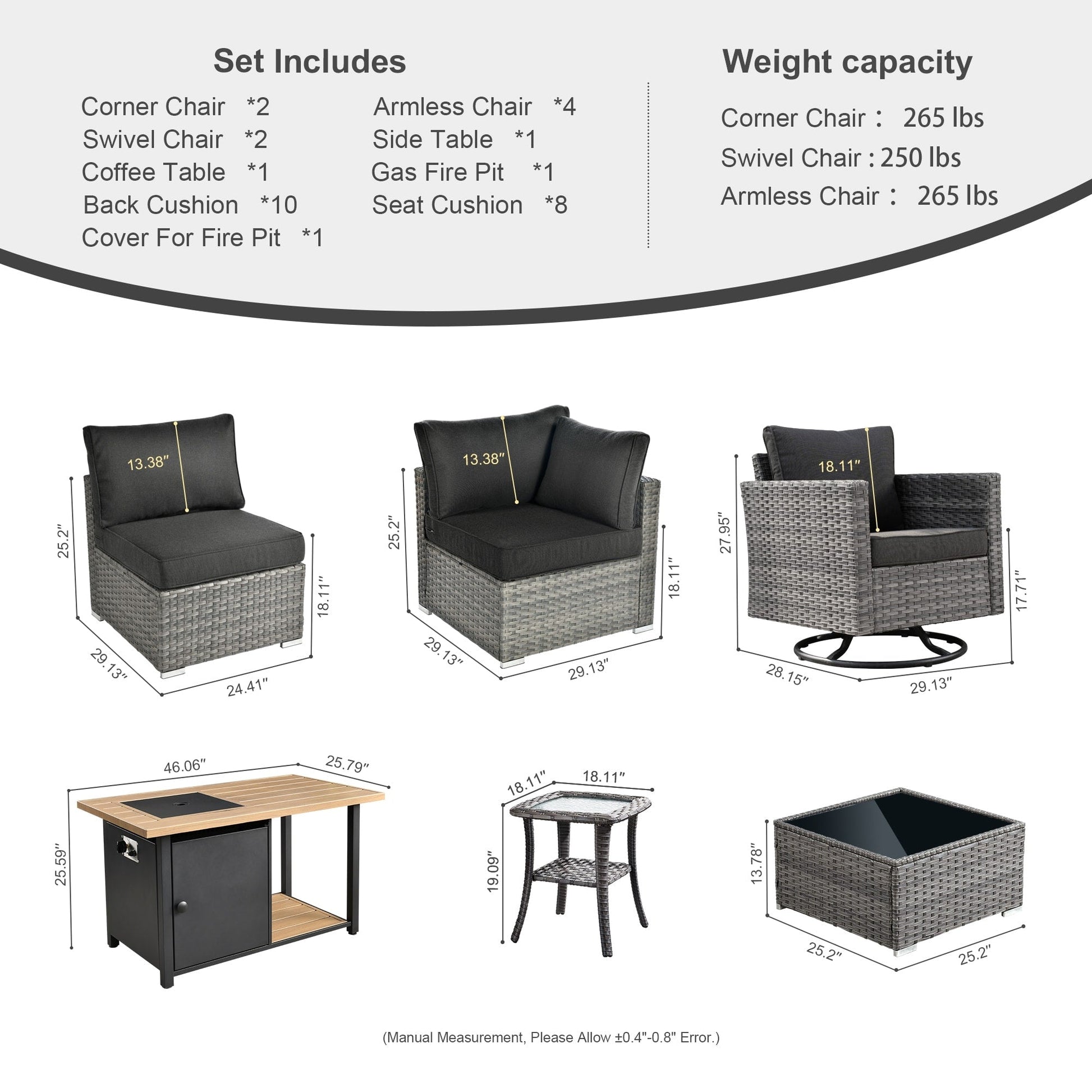 Ensemble de salon sectionnel OVIOS en osier à siège profond, 11 pièces, chaises pivotantes, foyer