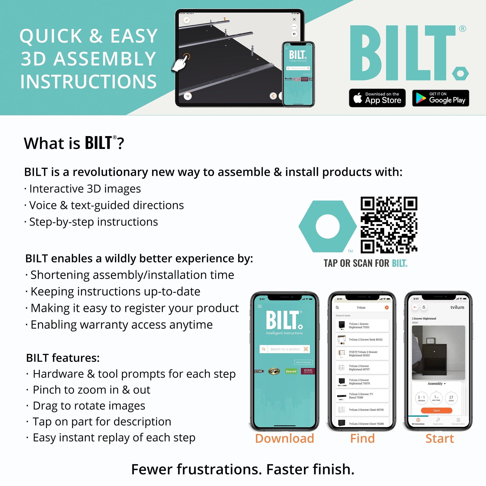 - Assemblage interactif 3D avec BILT : les instructions pour ce produit sont disponibles via l'application gratuite BILT. Découvrez une méthode révolutionnaire d'assemblage et d'installation grâce à la voix, au texte et aux images animées interactives.