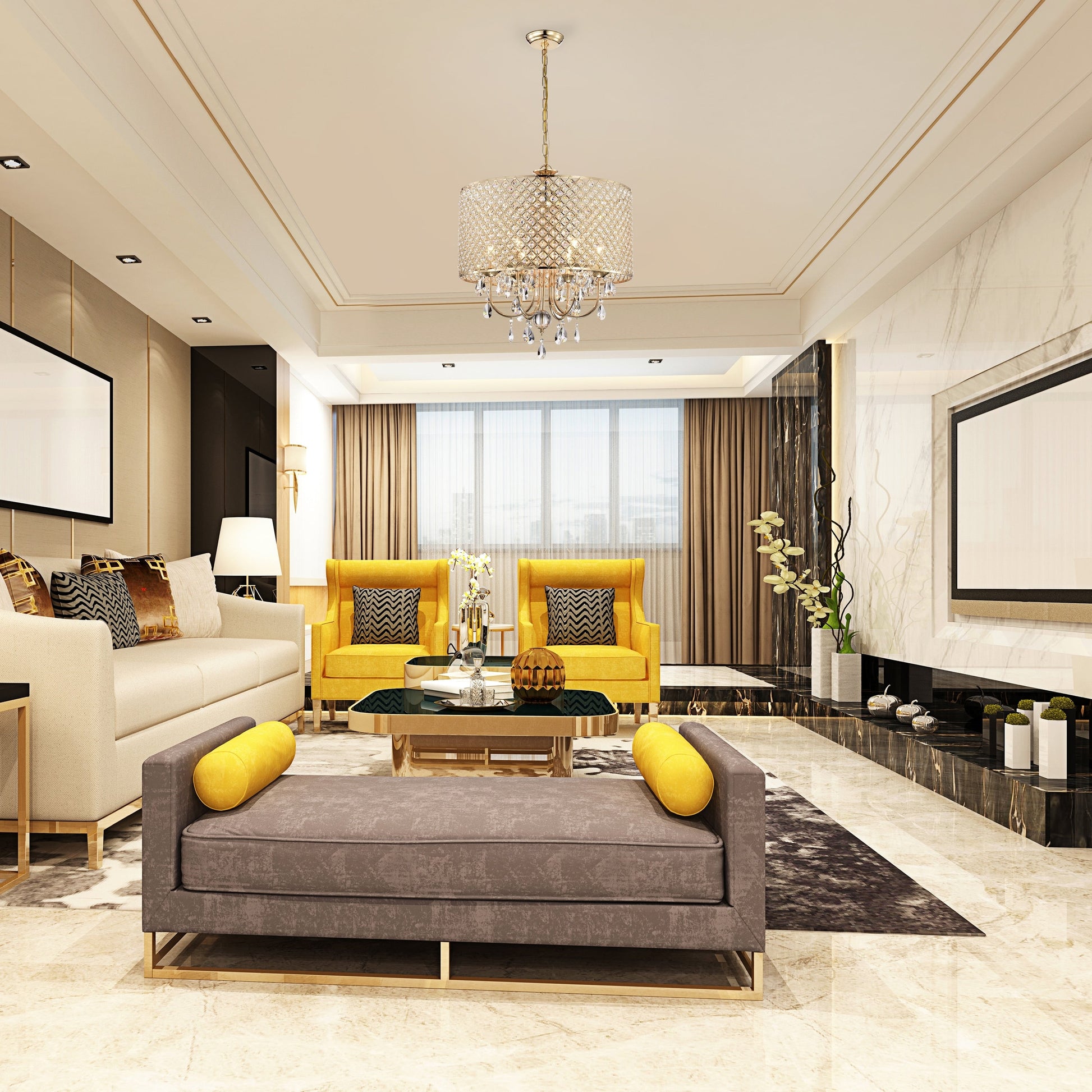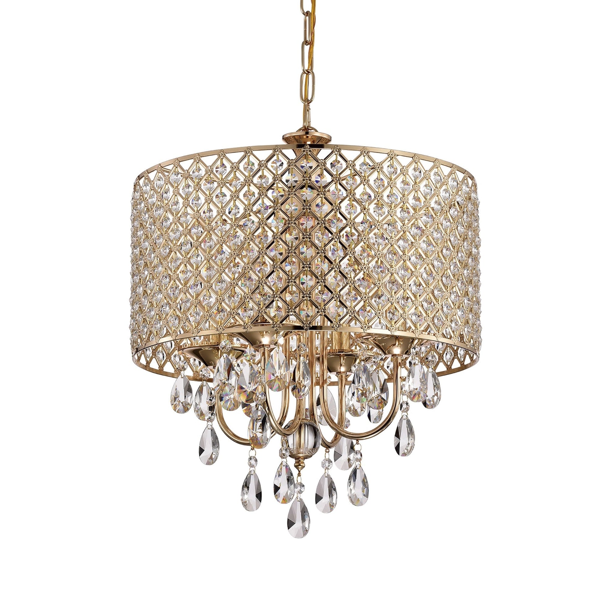 Ajoutez glamour et sophistication à votre espace avec ce lustre tambour rond orné de perles, orné de cristaux en cascade et d'un abat-jour tambour incrusté de cristaux. Son élégante finition dorée apporte une touche luxueuse à n'importe quelle pièce. Disponible en versions quatre et six lumières, ce lustre est doté d'une chaîne réglable de 102 cm, ce qui le rend idéal pour différentes hauteurs de plafond et tailles de pièces. Les lumières orientées vers le haut créent une lumière d'ambiance, créant une ambiance romantique et théâtrale pour chaque occasion.
