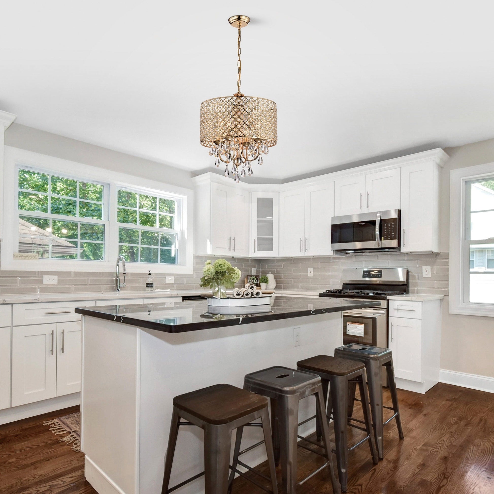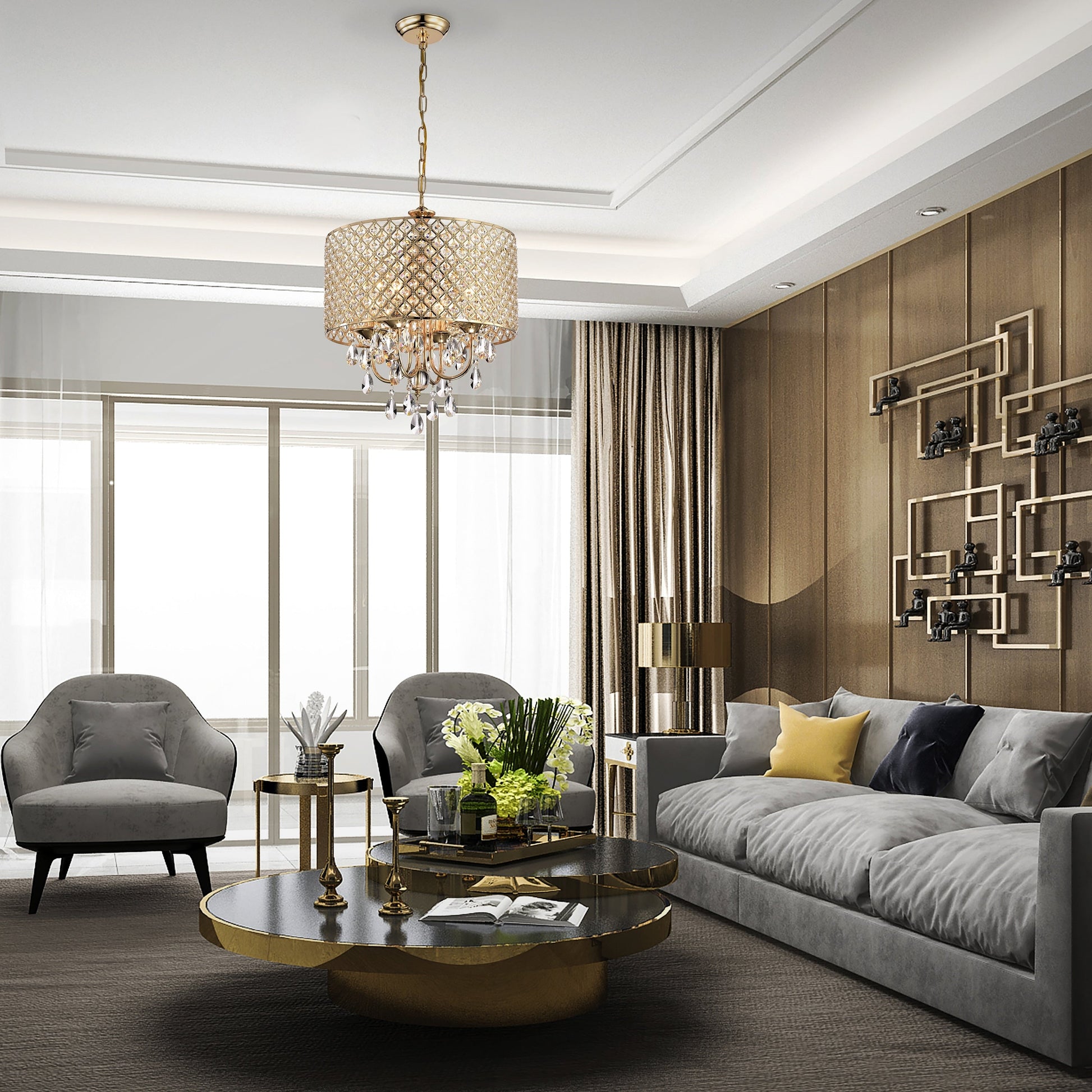 - Lustre à 4 lumières : 17 po de diamètre x 20 po de hauteur avec suspension en cristal, dimensions du tambour : 17 po de diamètre x 8,75 po de hauteur