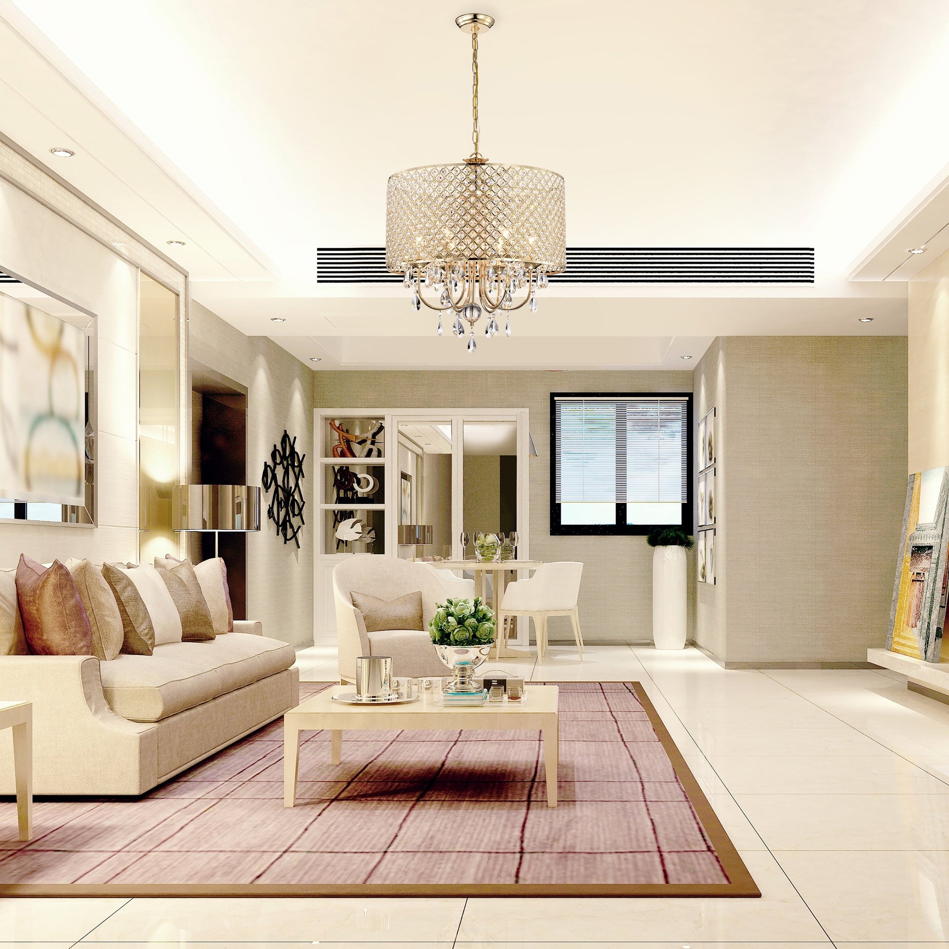 - Lustre à 6 lumières : 22 po de diamètre x 24 po de hauteur avec suspension en cristal, dimensions du tambour : 22 po de diamètre x 11 po de hauteur