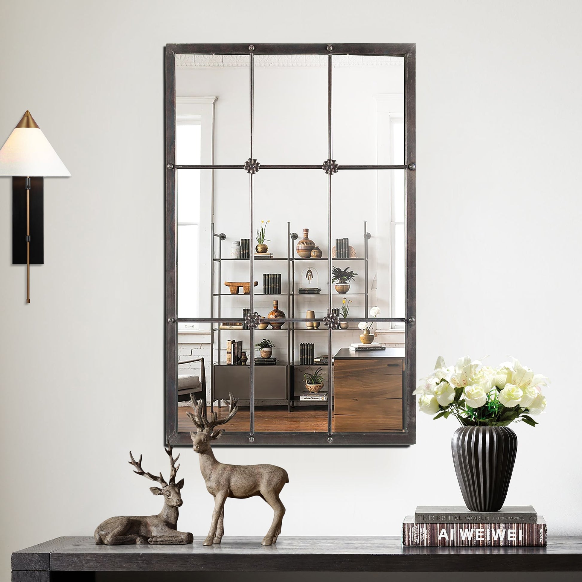 Marre des murs ennuyeux ? Ce miroir mural classique à carreaux apportera instantanément de la lumière à votre intérieur et créera une illusion d'espace. Ce miroir rectangulaire est composé d'un seul morceau de miroir derrière neuf sections de carreaux et est livré prêt à être accroché avec la quincaillerie incluse. Il est prêt à être fixé sur toute surface plane grâce aux attaches métalliques fixées au dos du cadre. Il peut être suspendu horizontalement ou verticalement, selon vos envies. Le cadre est en métal et le miroir est divisé en sections pour imiter une fenêtre. Illuminez votre intérieur avec ce magnifique miroir mural à carreaux. Son cadre en métal à la finition marron rustique est orné d'une fleur en métal au centre. Ce miroir mural sera un point de mire idéal pour votre entrée, votre salon, votre couloir ou votre chambre.