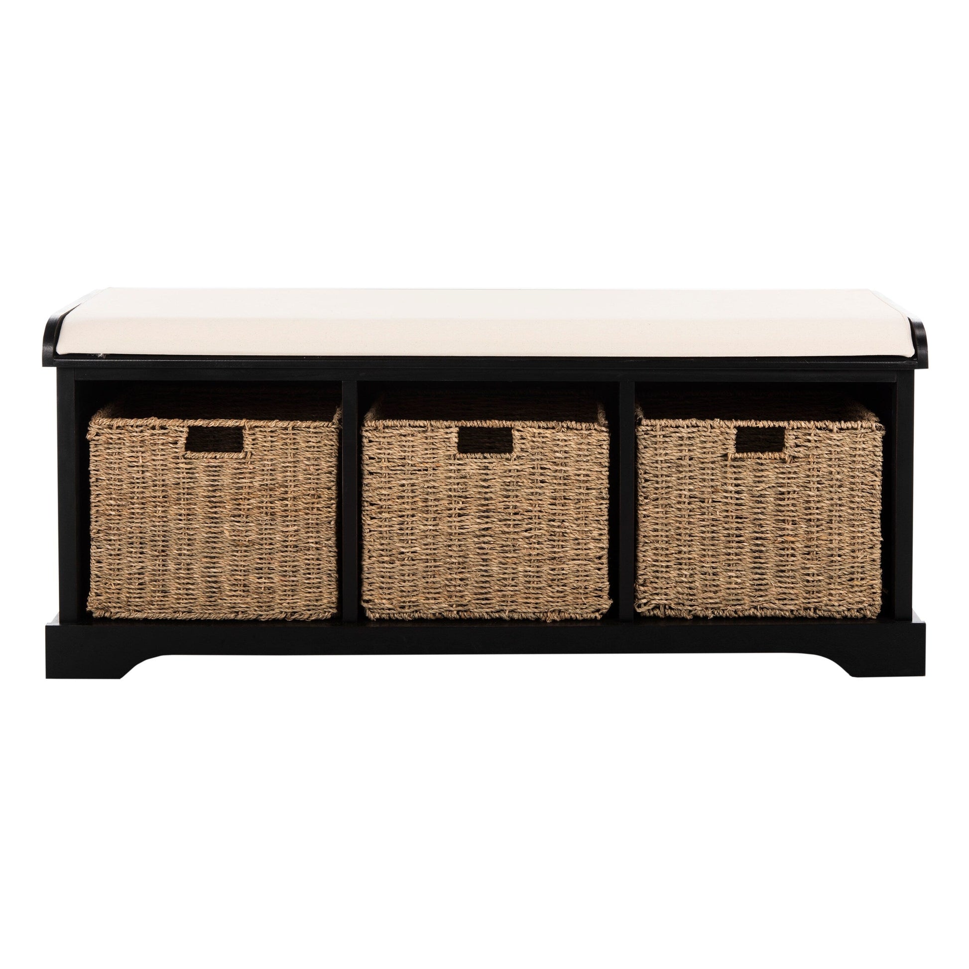 Ce banc de rangement est idéal pour ranger vos bottes dans l'entrée ou vos chaussures de jardin dans le vestiaire. Fabriqué en pin à la finition lisse, ce meuble est doté de trois paniers tressés amovibles pour un rangement facile, et un coussin en coton blanc complète son style avec confort et charme campagnard.