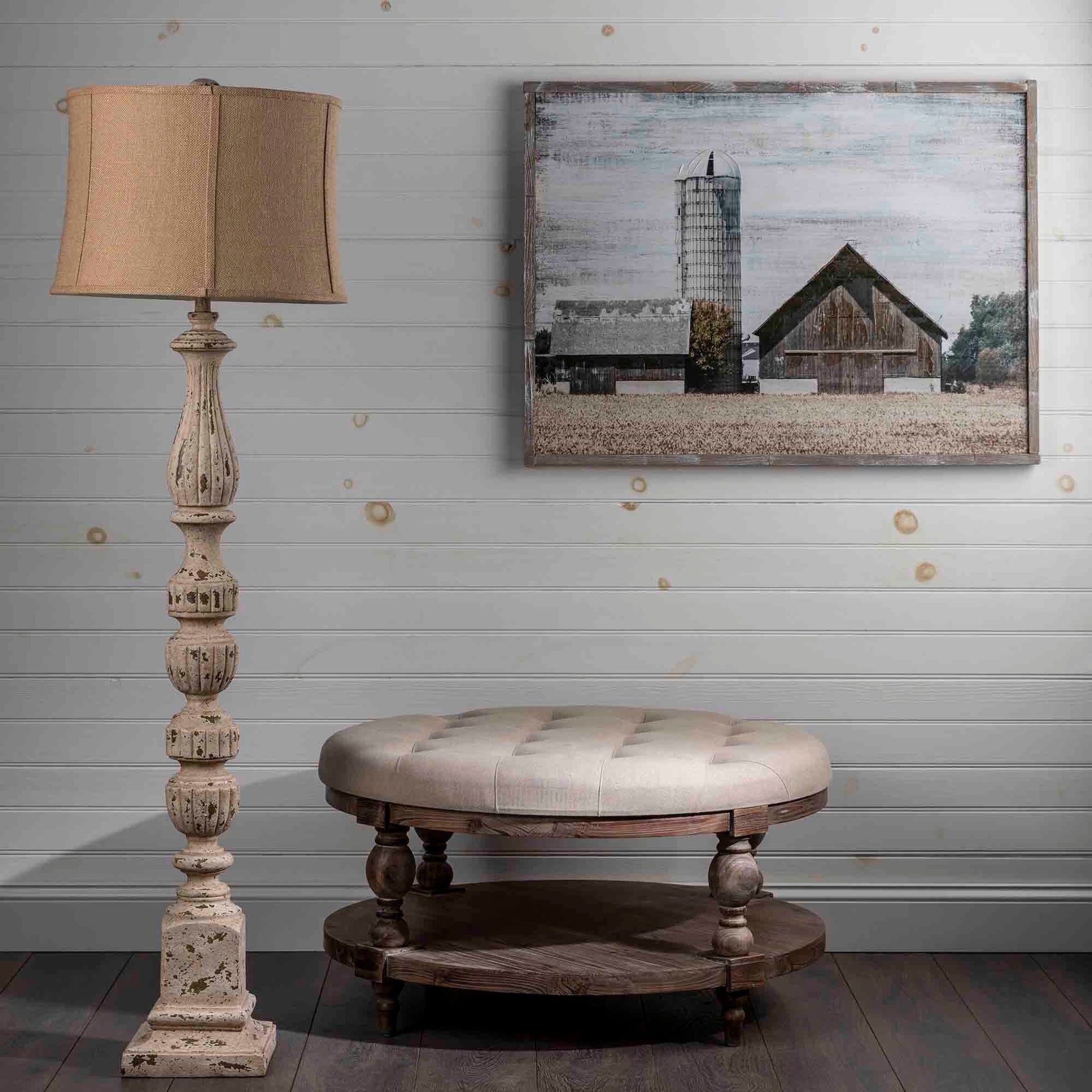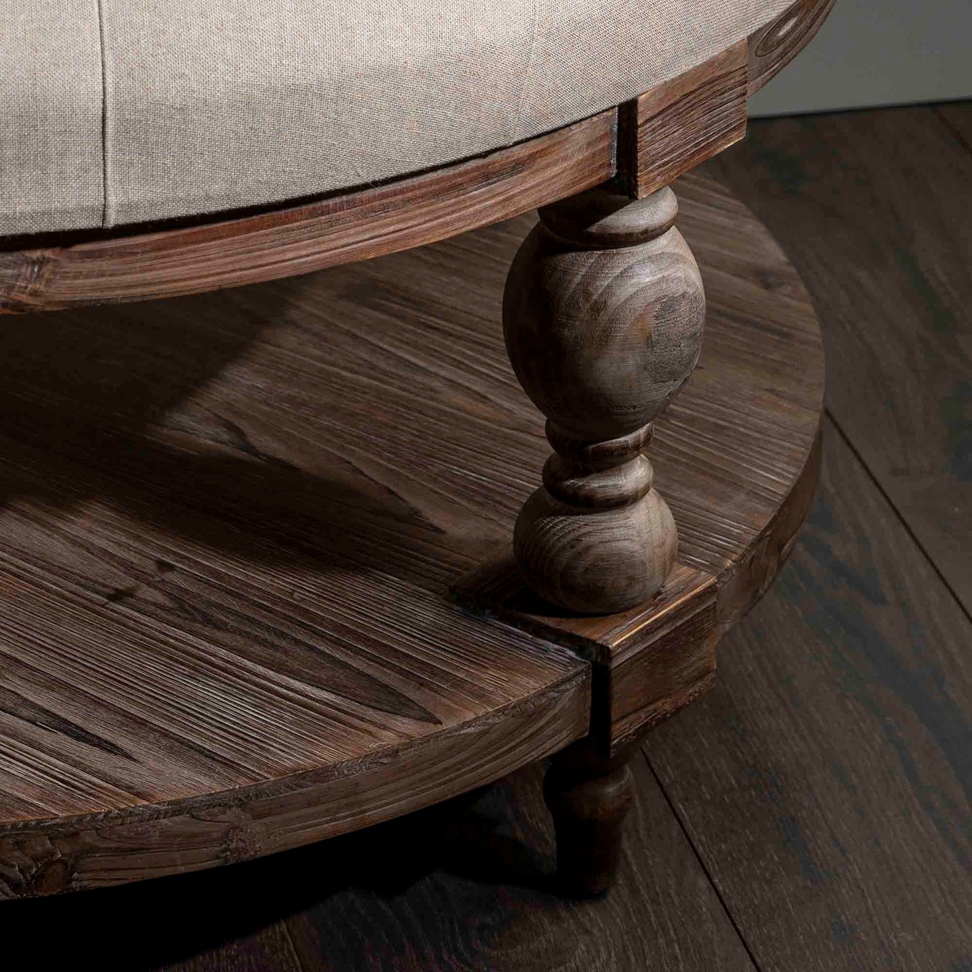 Tradition et confort se marient dans le pouf Tahoe en bois rustique et tissu lin rond, doté d'une tablette inférieure pour le rangement et d'un plateau rembourré pour la détente. La finition en sapin brun clair des pieds tournés ajoute de la profondeur au coussin en lin crème, idéal pour reposer vos pieds ou vous asseoir. Sa forme ovale s'intègre facilement à la plupart des espaces.