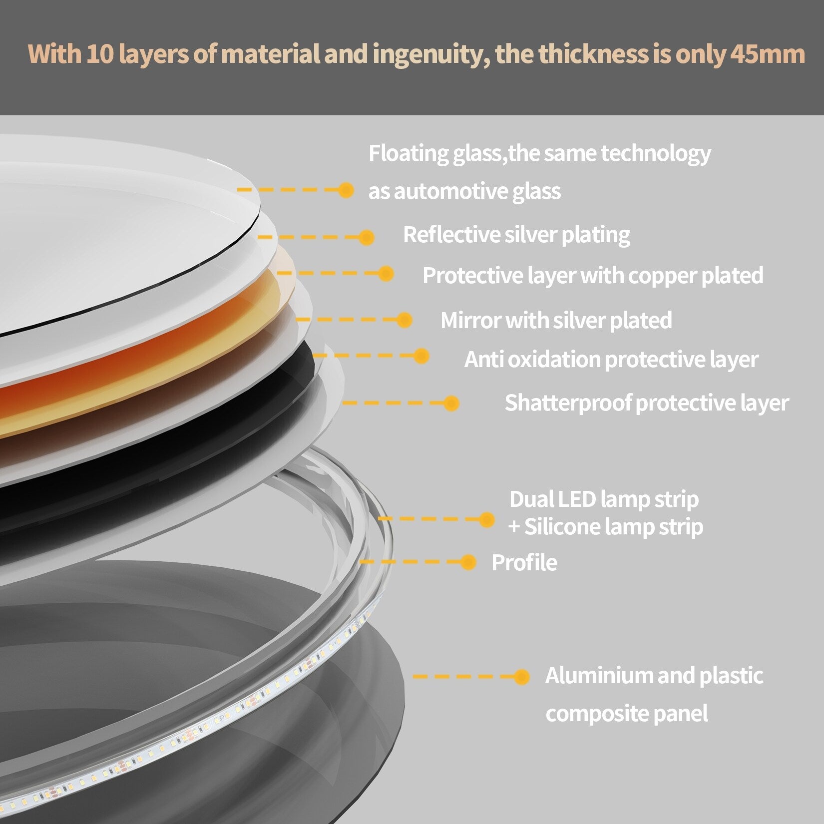 Ce miroir de salle de bain éclairé présente une forme circulaire caractéristique et un design attrayant. Il dispose de trois couleurs d'éclairage et d'une luminosité réglable pour un éclairage parfait pour le maquillage et le rasage. Sa fonction antibuée vous permet de voir clairement le reflet à tout moment. C'est un excellent choix pour de nombreuses salles de bains.
