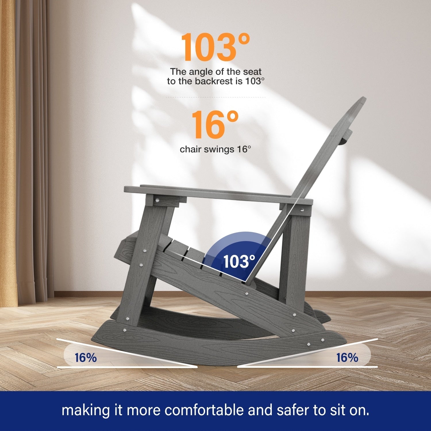 Bring style and durability to your indoor/outdoor space with the WINSOON All Weather HIPS Outdoor Rocking Chair. This chair is made of HIPS, a sturdy and water/UV/weather-resistant material that won't fade, crack, warp, peel, or rot. The wood grain appearance adds a classic touch without the maintenance of real wood. This chair is equipped with a high backrest and wide armrests, providing maximum comfort and stability. It has passed 120000 tests and is suitable for year-round use. Assembling the chair is easy and comes with all stainless tools included. It also comes with a 3-year warranty.